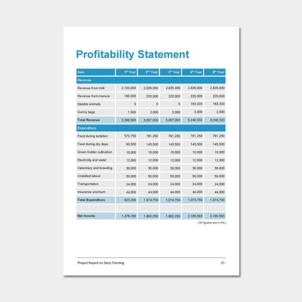 - Profitability Statement: Calculation of profit in your proposed dairy project. Net income will be calculated after deducting the expense from total revenue.